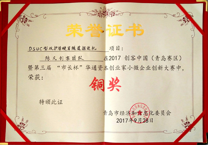 9月28日,2017創(chuàng)客中國(青島賽區(qū))暨第三屆“市長杯”華通資本創(chuàng)業(yè)家小微企業(yè)創(chuàng)新大賽決賽在海爾全球創(chuàng)新模式研究中心開賽,15個優(yōu)秀創(chuàng)新項(xiàng)目上演了“尖峰對決”和終極PK,最終,中船重工(青島)軌道交通裝備有限公司-陳凡創(chuàng)客團(tuán)隊(duì)的參賽項(xiàng)目“DSUC型雙護(hù)盾硬巖隧道掘進(jìn)機(jī)”以總決賽第三名的優(yōu)異成績獲得大賽銅獎。國家工信部中小企業(yè)局等領(lǐng)導(dǎo)為獲獎項(xiàng)目頒發(fā)了獎杯和證書。