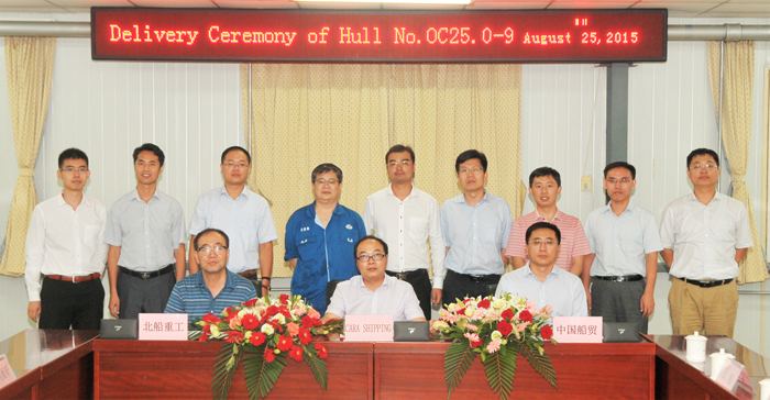 8月25日,公司成功交付一艘25萬噸級散貨船。新加坡CARA SHIPPING公司副總裁胡顯宏、中國船貿(mào)船舶二部部長李常永、公司總經(jīng)理助理王炳義共同簽署交接船議定書。公司副總經(jīng)理王國海與相關(guān)嘉賓共同見證了交船儀式。