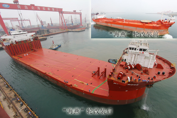“海燕”輪由穿梭油輪改裝成半潛式重吊運(yùn)輸船項(xiàng)目,在北海尚屬首例,其工程和工程難度相當(dāng)于建一艘新船。該輪于2014年6月11日進(jìn)廠,2015年6月27日至30日成功試航,7月9日至10日成功完成深水下潛試驗(yàn)(下潛21.5米),7月14日順利交付。在廠改裝期間,“海燕”輪共經(jīng)歷了6次進(jìn)塢,將船體縮短了60米,船艏增加了駕駛樓;改裝拆除舊管系2萬米,新加壓載、掃倉、透氣管系近900噸;割除分解舊鋼板7500多噸,預(yù)制、搭載新分段8200多噸;原船及新建壓載艙特涂工程14萬平方米;艏部新加駕駛樓及艉部新加船員房間內(nèi)部舾裝,共敷設(shè)電纜19萬米;安裝艏部駕駛臺各類通導(dǎo)、通信設(shè)備設(shè)施,并完成電氣設(shè)備的調(diào)試工作。船東評價(jià)“海燕”輪改裝狀況非常好,并表達(dá)了今后繼續(xù)合作的意愿。DNV船級社代表認(rèn)為改裝后的新船基本滿足了設(shè)計(jì)要求。尤其是船首增加了駕駛樓,實(shí)現(xiàn)了艏艉都能操縱開船,實(shí)屬罕見。包括變距槳、艏艉側(cè)推、貝克舵、導(dǎo)流罩在內(nèi)的船舶推進(jìn)系統(tǒng)經(jīng)改造后功能先進(jìn),對調(diào)節(jié)航速、轉(zhuǎn)向和經(jīng)濟(jì)性、效率都有顯著提高。