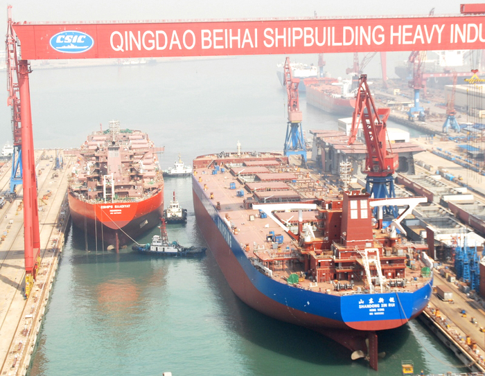 圖二:8月27日,公司造船史上一項(xiàng)新記錄誕生:礦砂船與散貨船首次實(shí)現(xiàn)同塢建造、同天出塢。 (圖?M崔應(yīng)升 林建平)