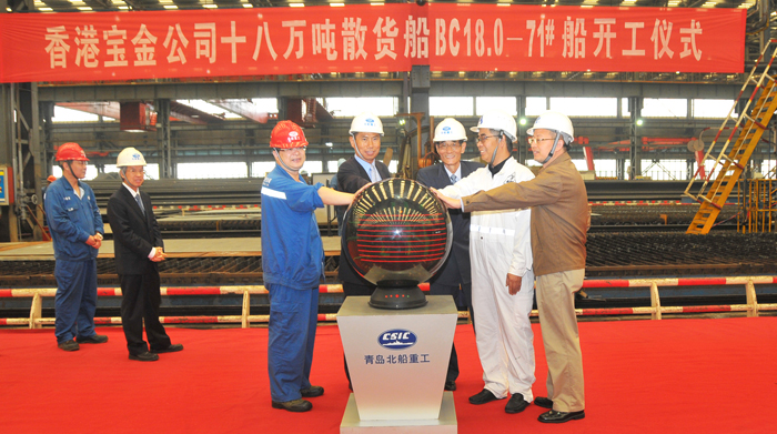 6月25日,公司為香港寶金企業(yè)有限公司建造的18萬噸散貨船71號船、70號船,分別在船體制作工程部聯(lián)合加工廠房和1號造船塢舉行了現(xiàn)場開工儀式和鋪底儀式。
